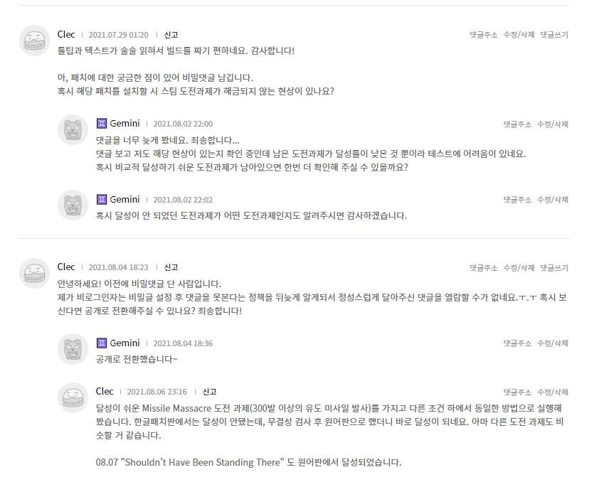 다음 날인 4월 16일날 업적이 달성되지 않는다는 제보가 디스코드 내에서 나왔고, 곧바로 수정이 되었습니다