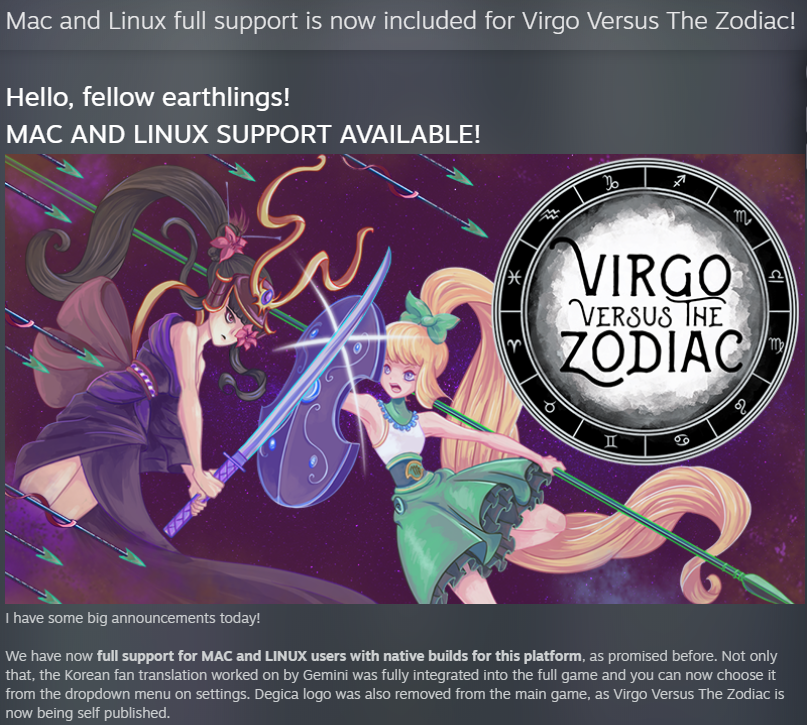 Virgo Versus The Zodiac - Mac and Linux full support is now included for Virgo Versus The Zodiac! - Steam News