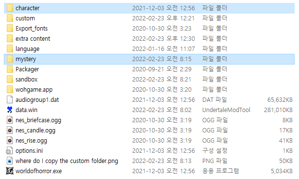 미스터리와 캐릭터의 경우는 불러오는 경로가 다른데, 각각 게임 폴더 내의 mystery / character 폴더에다 넣어 주면 됩니다