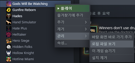 1) 스팀 라이브러리에서 Gods Will Be Watching 우클릭 > 관리 > 로컬 파일 보기를 눌러 게임 폴더에 접근합니다.