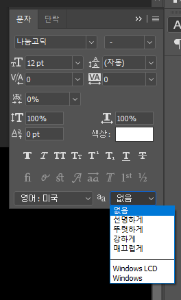 포토샵에서는 텍스트 상자의 설정을 다음과 같이 하시면 깔끔한 픽셀 폰트를 출력할 수 있으며, 게임메이커 등에서는 안티앨리어싱을 off로 설정하시면 됩니다.