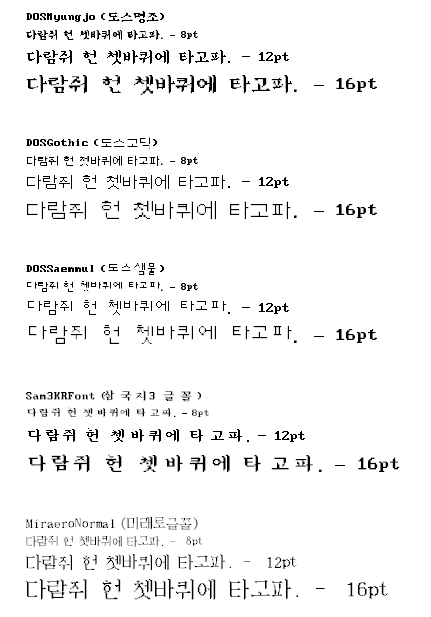 저는 도스명조, 도스고딕, 미래로글꼴, 이렇게 세 종류만 조금 써 본 것 같네요.